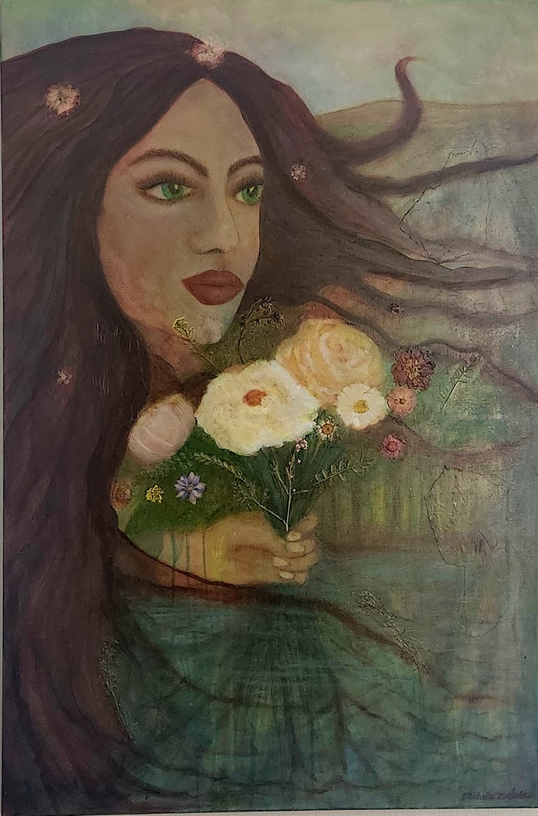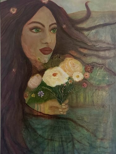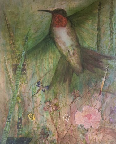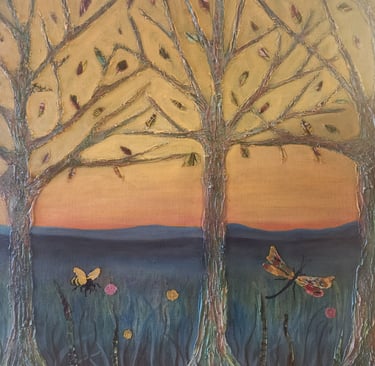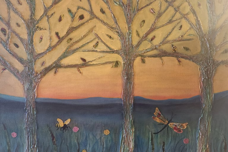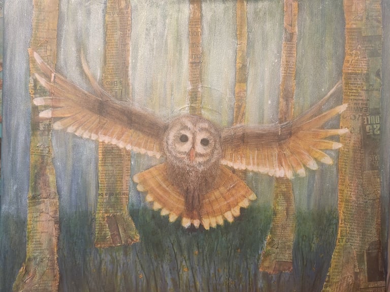 I am a whimsical, nature inspired, mixed media artist. I paint in both acrylic and oil, but frequently I use a layering technique, combining newspaper, fabric, modelling paste and dried flowers, to create a multi-layered, recycled, textured piece of art.